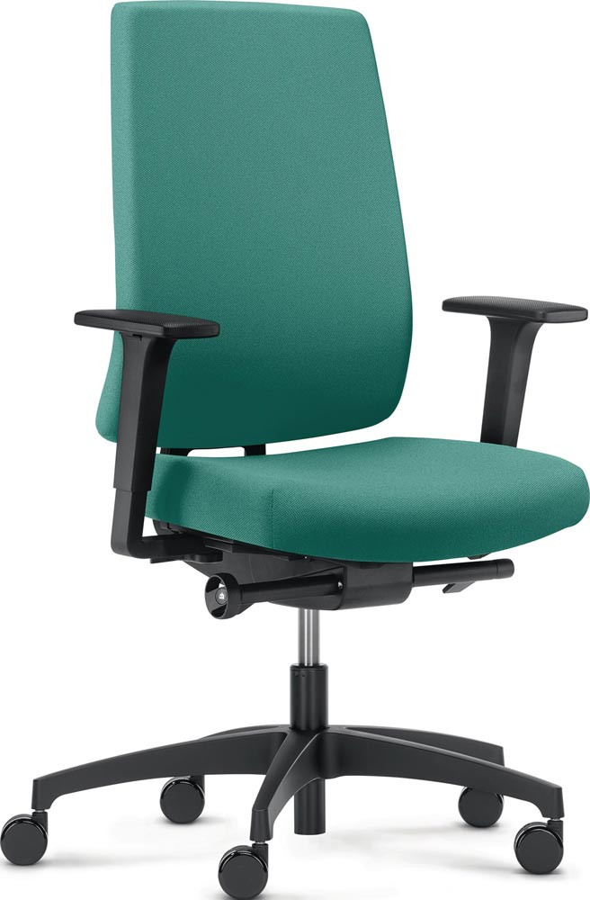 mit Synchrontechnik (mit Armlehnen) · für überwiegend sitzende Tätigkeiten · belastbar bis 150 kg Körpergewicht · stabiles Kunststofffußkreuz, schwarz · hohe Polsterrückenlehne höhenverstellbar mittels Easy-Touch-System · Armlehnen höhen- und breitenverstellbar, mit PU-Auflage · seitliche Einstellung des Rückenlehnengegendrucks im Sitz mittels Handrad · Polster 100 % Polyester · Sitzfläche B 470 x T 380-440 mm · Sitztiefenverstellung 80 mm mittels Schiebesitz · Lehnenhöhe 610-680 mm · Universalrollen für weiche und harte Böden