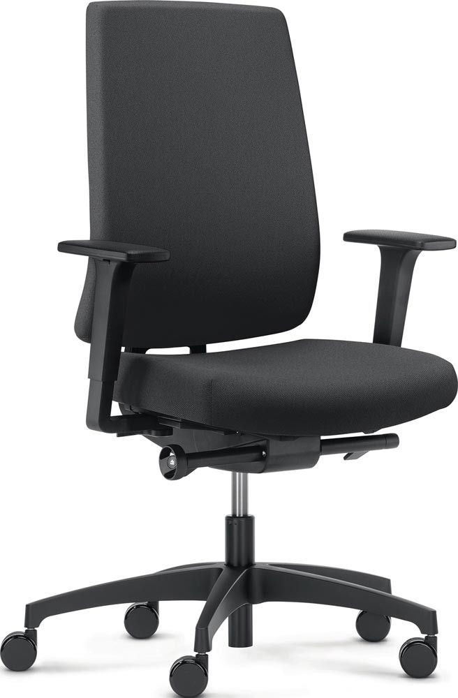 mit Synchrontechnik (mit Armlehnen) · für überwiegend sitzende Tätigkeiten · belastbar bis 150 kg Körpergewicht · stabiles Kunststofffußkreuz, schwarz · hohe Polsterrückenlehne höhenverstellbar mittels Easy-Touch-System · Armlehnen höhen- und breitenverstellbar, mit PU-Auflage · seitliche Einstellung des Rückenlehnengegendrucks im Sitz mittels Handrad · Polster 100 % Polyester · Sitzfläche B 470 x T 380-440 mm · Sitztiefenverstellung 80 mm mittels Schiebesitz · Lehnenhöhe 610-680 mm · Universalrollen für weiche und harte Böden