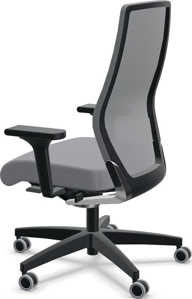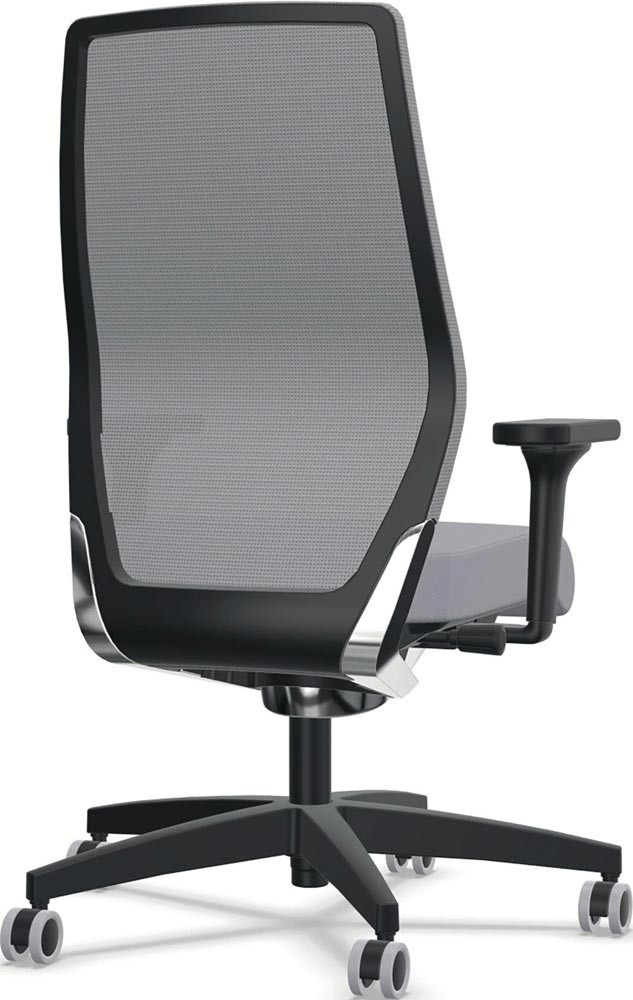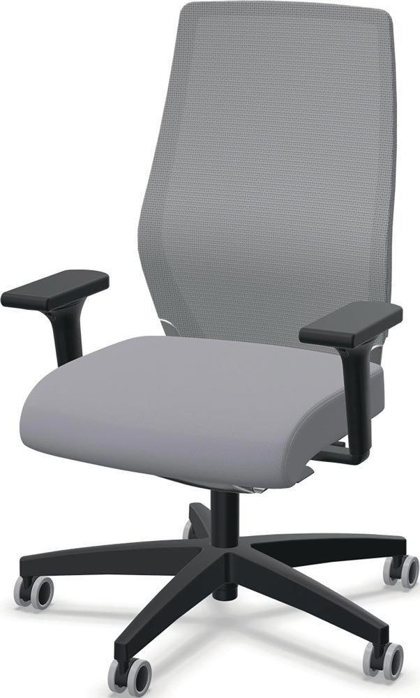 mit Synchrontechnik (mit Armlehnen) · für überwiegend sitzende Tätigkeit · stabiles Kunststoff-Fußkreuz, schwarz · mit seitlicher Feineinstellung des Rückenlehnengegendrucks mit wenigen Umdrehungen · mit Netzrückenlehne · Sitztiefenverstellung 70 mm per Schiebesitz · Armlehnen höhen-/breiten- und tiefenverstellbaren, mit PU-Auflage · Sitzbezug aus 100 % Polyester · Sitzfläche B 500 x T 480-550 mm ∙ Lehnenhöhe 640 mm · Universalrollen für weiche und harte Böden
