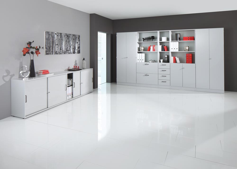 ∙ Beidseitig melaminharzbeschichtete Oberflächen, blend- und reflexarm, abriebfest und pflegeleicht ∙ Von oben verstellbare Sockelfüße zum Ausgleich von Bodenunebenheiten