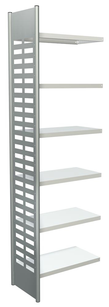 · Seitenrahmen aus Rundrohr Ø 40 mm mit verschweißten Seitenblechen, pulverbeschichtet in alusilber ähnl. RAL 9006 · Fachböden in RAL 7035 lichtgrau, mit Sicherheitskantung 40 mm hoch und höhenverstellbar im Raster von 86 mm