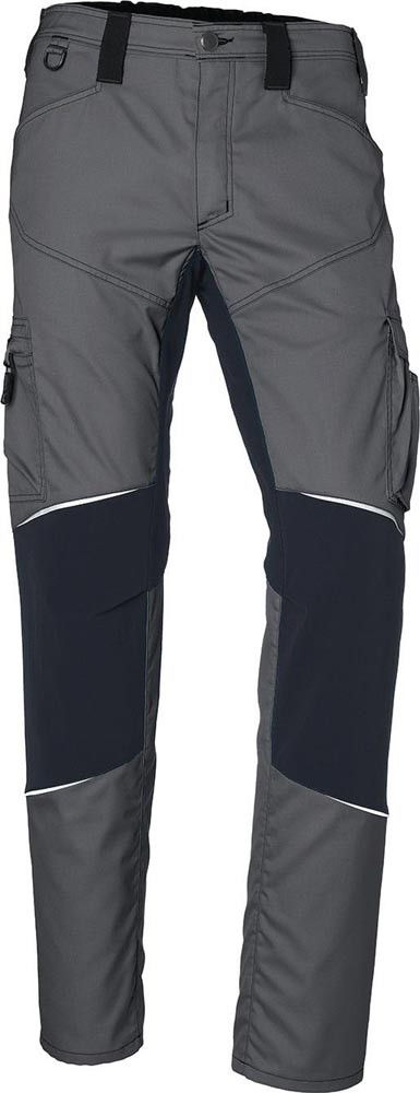 50% Baumwolle / 50% Polyester, ca. 180 g/m² · 2 Seitentaschen · 2 Gesäßtaschen mit Reißverschluss · rechts: D-Ring in Bundnaht und Schenkeltasche mit Reißverschluss, integrierte Smartphonetasche und zusätzliche Meterstabtasche · links: Schenkeltasche mit Patte und Druckknopf, aufgesetzte Stifttaschen, integrierte Smartphonetasche und zusätzliche Mehrzwecktasche · ergonomisch geformte, griffige Zipper · Stretcheinsätze im Schritt-, Knie- und Gesäßbereich · elastischer Bundeinsatz · Gürtelschlaufen aus stabilem Kofferband · Schlitz mit Reißverschluss · vorgeformtes Knie mit Bewegungszone