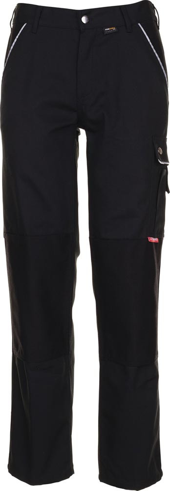 65% Polyester / 35% Baumwolle · Canvas-Bindung · ca. 320 g/m² · Geweberückseite sehr atmungsaktiv, besonders strapazierfähig, einlauffest nach DIN EN ISO 6330 · Knietaschen aus Cordura® · 2 eingesetzte Beuteltaschen aus Cordura® · rechts doppelte Maßstabtaschen aus Cordura® · Reflexbiesen an den Tascheneingriffen und Taschenpatten · links Oberschenkeltasche mit Patte und Druckknöpfen, darauf aufgesetzte Handytasche · Gummizug im Bund · rechts 1 verstärkte Gesäßtasche · Rundbund mit 7 Gürtelschlaufen und Jeansknopf