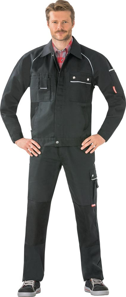 65% Polyester / 35% Baumwolle · Canvas-Bindung · ca. 320 g/m² · Geweberückseite sehr atmungsaktiv, besonders strapazierfähig, einlauffest nach DIN EN ISO 6330 · Knietaschen aus Cordura® · 2 eingesetzte Beuteltaschen aus Cordura® · rechts doppelte Maßstabtaschen aus Cordura® · Reflexbiesen an den Tascheneingriffen und Taschenpatten · links Oberschenkeltasche mit Patte und Druckknöpfen, darauf aufgesetzte Handytasche · Gummizug im Bund · rechts 1 verstärkte Gesäßtasche · Rundbund mit 7 Gürtelschlaufen und Jeansknopf