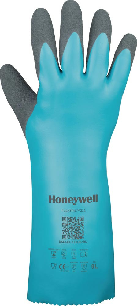 nach EN 388, EN 374, EN 407 · Kat. III · Material: Nitril mit Mikroschaum auf Nylon-Liner · hoher Schutz gegen Chemikalien · zuverlässige Schnittfestigkeit durch Schnittschutzlevel A1/A · für Lebensmittel geeignet · Honeywell Super Grip-Technologie (SGT) bietet die benötigte Rutschhemmung, bei Trockenheit und Nässe · ergonomisches Design bietet Unterstützung der Hände sowie hohen Tragekomfort · kein Schwitzen dank der Honeywell Moisture Dispersion-Technologie