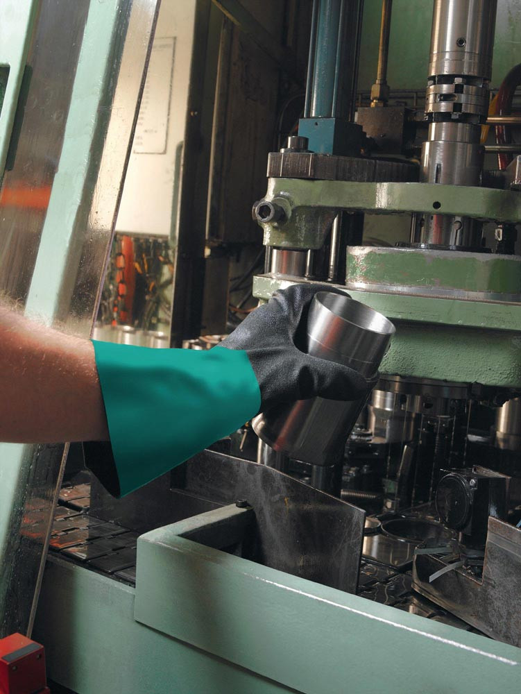 nach EN 374 · EN 388 · EN 407 · Kat. III · Material: Nylon mit Nitrilbeschichtung · Ansell Grip Technology® · kontrollierte Handhabung von nassen oder öligen Objekten mit weniger Kraftaufwand beim Greifen · Chemikalienschutz · Griffsicherheit · Flexibilität · Beweglichkeit · flüssigkeitsdicht · für Lebensmittel geeignet · antistatisch gem. EN 1149 · Anwendung: Chemikalienverarbeitung, Druckindustrie, Bergbau, Luft-/Raumfahrtindustrie, Notdienste, Wartungsarbeiten, Agrarchemikalien, Umgang mit Chemikalien, Arbeiten mit verölten oder fettigen Gegenständen/Materialien, Raffination, Handhabung von Lacken, Druckfarben, Färbemitteln, Leimen und Kunststoffen