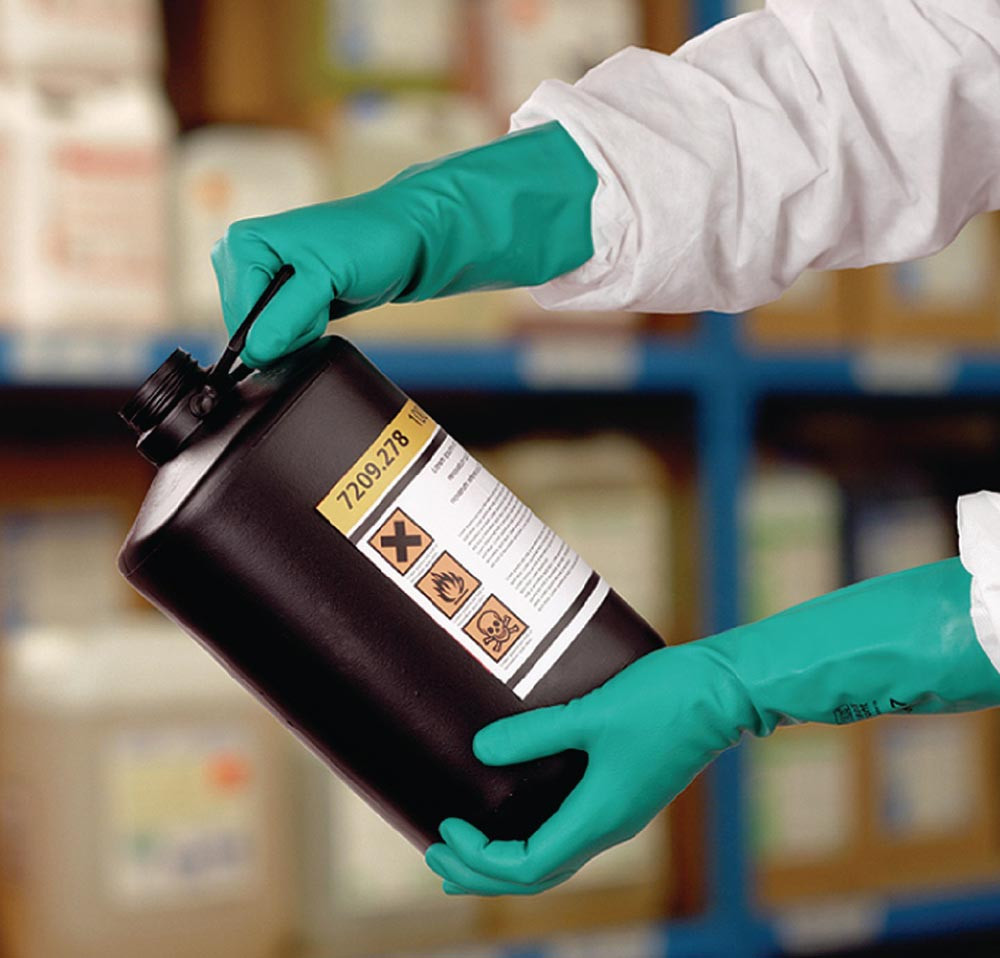nach EN 388 · EN 374 · Kat. III · Material: Nitril, velourisiert · Hammerschlag-Finish · optimal in trockenen und nassen Arbeitsbereichen · erstklassiger Chemikalienschutz · hohe Abriebfestigkeit · bemerkenswerter Tragekomfort · Flexibilität · außergewöhnlicher Tragekomfort · erhöhte Griffsicherheit · antistatisch gem. EN 1149 · Anwendung: chemische Verarbeitungsprozesse, Raffination, Metallherstellung, Agrarchemikalien, Druckindustrie