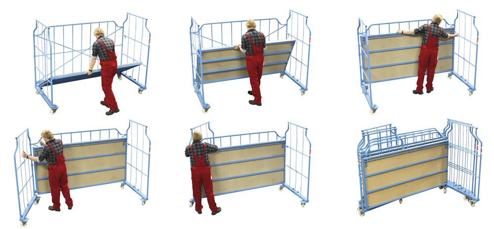 Das Transport- und Lagermittel für das optimale Lager. Sie schaffen Platz dort, wo er am meisten gebraucht wird, im Lager. Zusammengeklappt sind sie ganz klein, aufgeklappt wahre Meister der Raumnutzung. Ausführungen für spezielle Branchen (Möbel, Textil o.ä.) oder Ausführungen mit Gitterwänden usw. stehen auf Anfrage zur Verfügung.