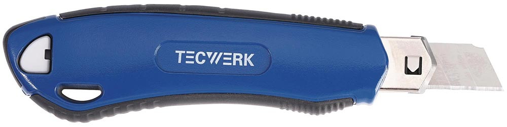 Gehäuse aus Aluminium · Klingenführung aus Edelstahl · mit weichem Gummigriff · Sicherheitsarretierung · integriertes Vorratsmagazin für Ersatzklingen mit automatischer Nachladung · pulverbeschichtet