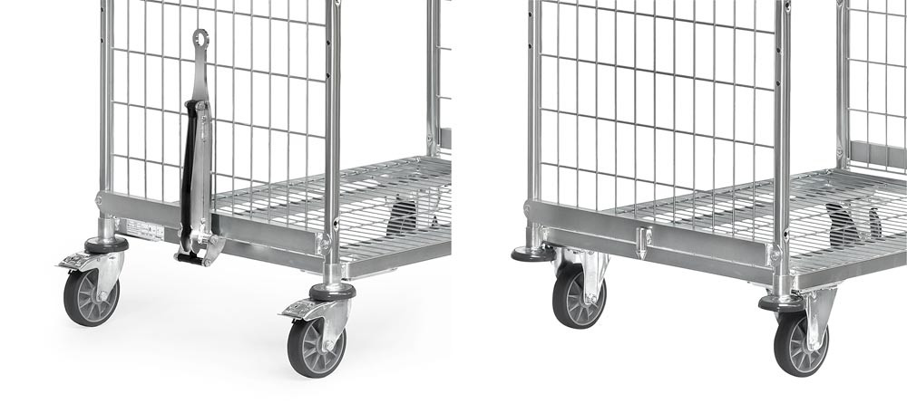 · Zum Fahren mit max. 3 Kommissionierwagen im Verbund · Max. Zuggeschwindigkeit 6 km/h · Anstelle der 2 Lenkrollen werden 2 Bockrollen verbaut · Deichsel aus Flachstahl profiliert · Durch Gasdruckfeder stellt sich die Deichsel selbsttätig aufrecht in Ruheposition · Kupplungsbolzen an gegenüberliegender Stirnseite · Verbinden durch Fußbetätigung möglich · Nicht mit Trittstufen kombinierbar