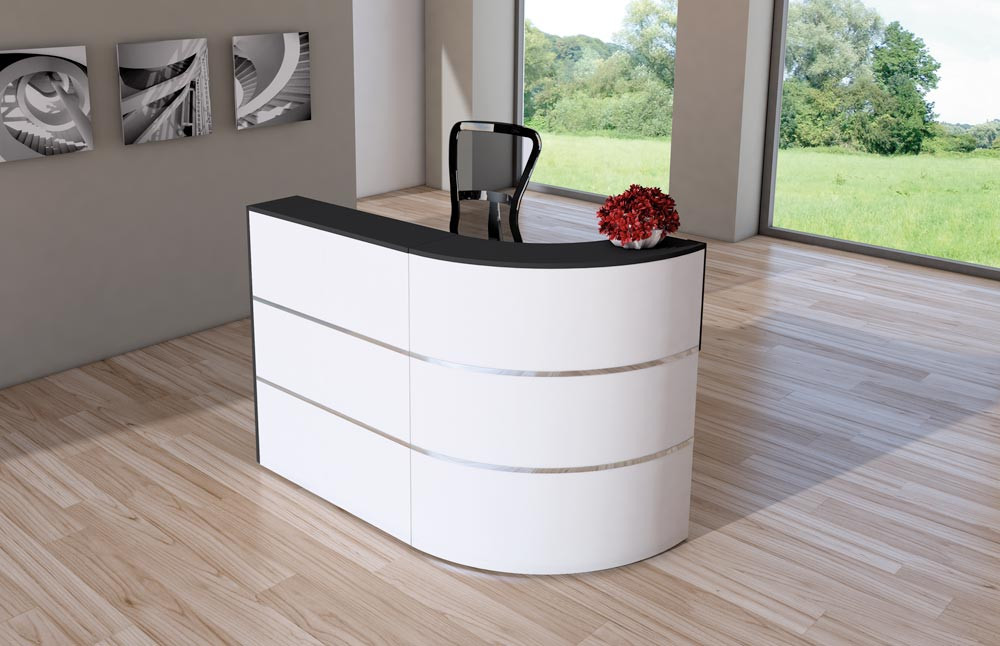 ∙ Stahl-/Holzkonstruktion ∙ Thekenkörper aus Metall in weiß mit dekorativen Edelstahlstreifen ∙ Melaminharzbeschichtete Holzplatten mit ABS-Kante in anthrazit ∙ Kabeldurchlässe in der Arbeitsplatte ∙ Hinter den 1100 mm hohen Fronten befindet sich ein vollwertiger Arbeitsplatz mit einer Tiefe von 800 mm und einer Höhe von 740 mm ∙ Beliebig erweiterbar durch Anbauelement