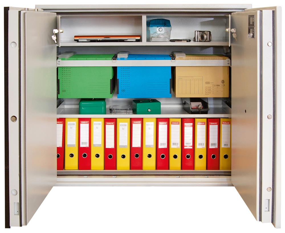 · Mit Bodenverankerung · Korpus und Tür allseitig mehrwandig, Türstärke 95 mm mit allseitiger Bolzenverriegelung · Beschläge und Scharniere 60 mm vorstehend · Durch spezielle Füllungen und Dichtungen sind darin aufbewahrte Dokumente, Akten, Geld, etc. optimal vor Bränden und Löschwasser geschützt · Die Schränke wurden an der TU Braunschweig erfolgreich einer Feuerwiderstand- und Sturzprüfung (Dauer 1 Stunde bis 1090 °C) unterzogen · Doppelbart-Sicherheitsschloss inklusive zwei Schlüsseln · Lackierung in RAL 7035 lichtgrau · Innentresore, Auszüge und weiteres Zubehör gegen Mehpreis