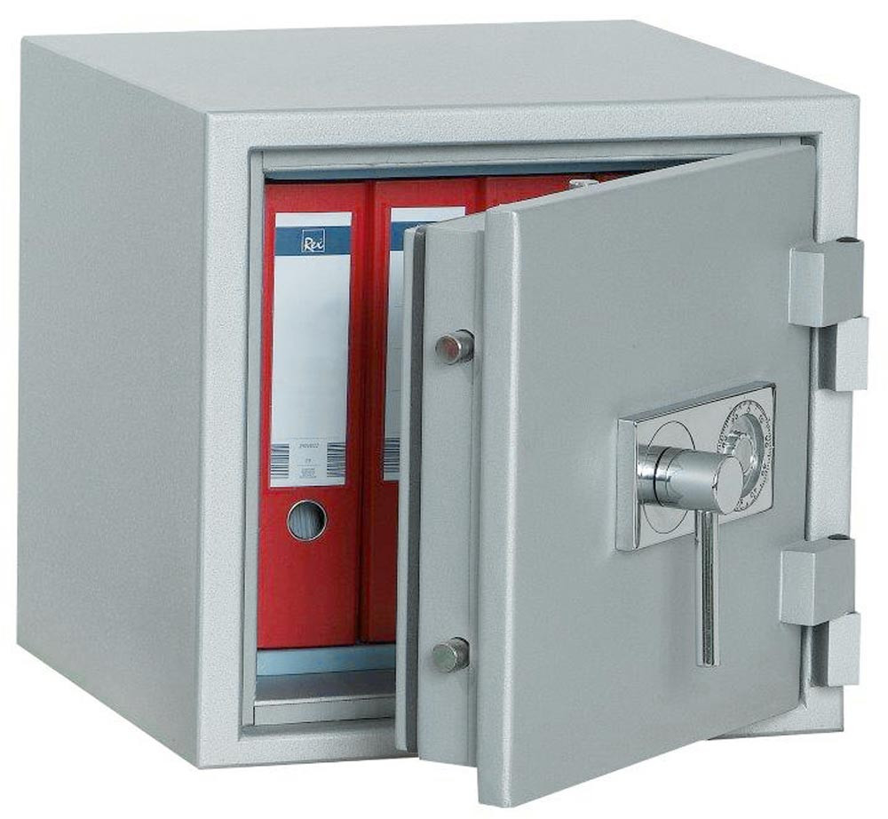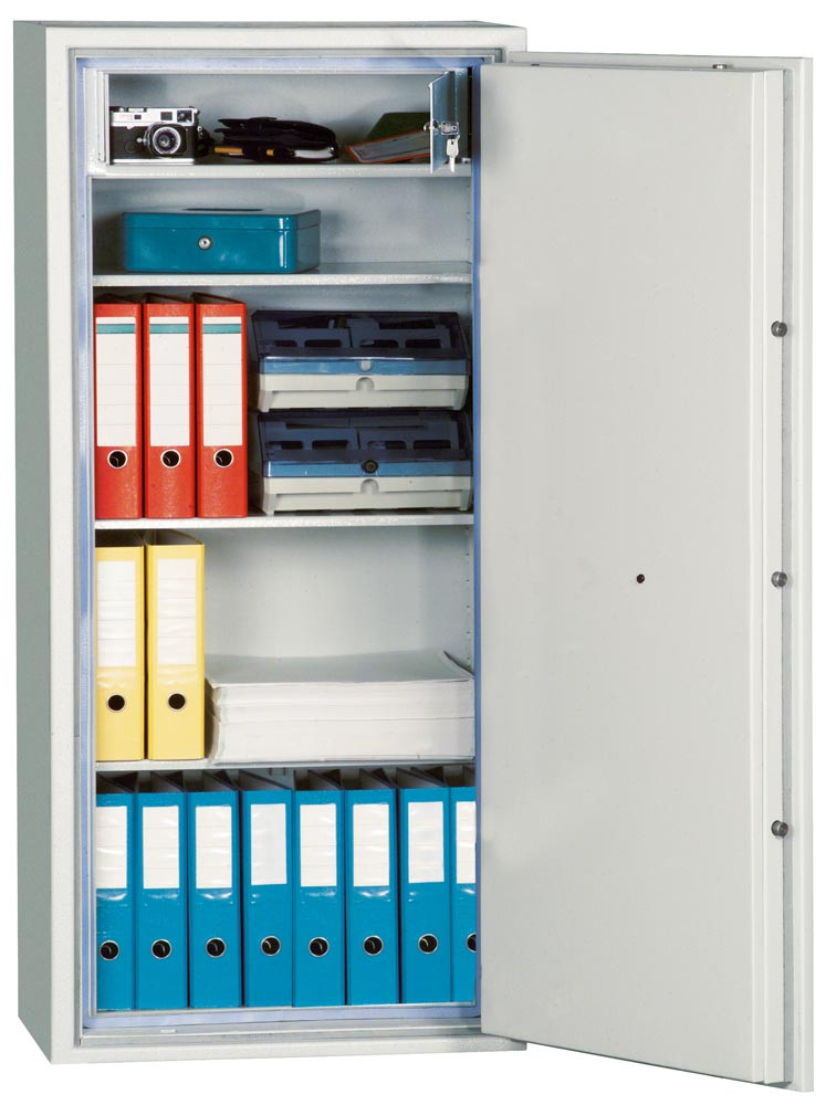 · Mit Bodenverankerung · Korpus und Tür allseitig mehrwandig, Türstärke 95 mm mit allseitiger Bolzenverriegelung · Beschläge und Scharniere 60 mm vorstehend · Durch spezielle Füllungen und Dichtungen sind darin aufbewahrte Dokumente, Akten, Geld, etc. optimal vor Bränden und Löschwasser geschützt · Die Schränke wurden an der TU Braunschweig erfolgreich einer Feuerwiderstand- und Sturzprüfung (Dauer 1 Stunde bis 1090 °C) unterzogen · Doppelbart-Sicherheitsschloss inklusive zwei Schlüsseln · Lackierung in RAL 7035 lichtgrau · Innentresore, Auszüge und weiteres Zubehör gegen Mehpreis