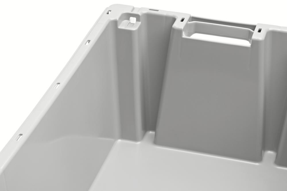 · Hergestellt aus HDPE · Lebensmittelgeeignet · Ergonomische Griffe für einfaches Handling · 75 % Volumenreduzierung durch Nestbarkeit · Enorme Bruchsicherheit durch hohe Wandstärken (auch bei niedrigen Temperaturen) · Temperaturbeständigkeit von -30 °C bis +40 °C, kurzzeitig auch bis +90 °C · Stabiler und glatter Boden · Glatte Wände ermöglichen einfache und gründliche Reinigung · Hohe Formstabilität durch umlaufenden Rand · Genoppte Etikettierflächen an den Stirnseiten · Pfeilmarkierungen als visuelle Unterstützung beim Stapeln · RFID Transponder · VE 2 Stück