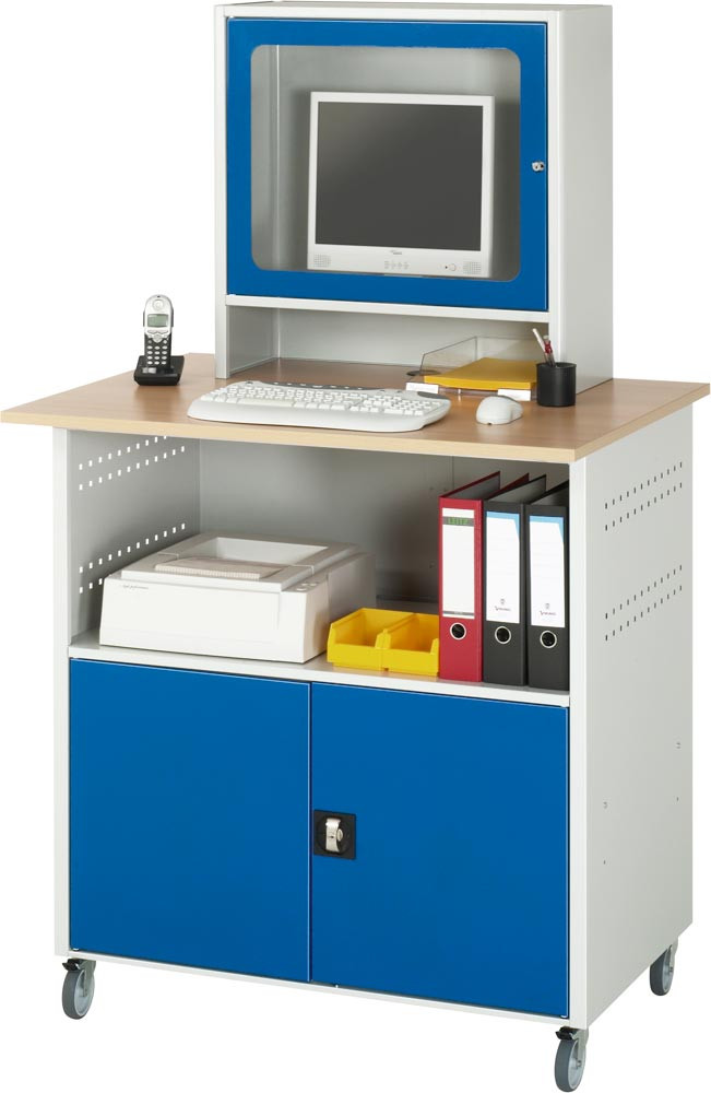 · Buche-Dekor-Arbeitsplatte (Stärke 22 mm) mit Kabeldurchlass ·Basisschrank (B x T x H 1100 x 630 x 1035 mm) oben mit offenem Ablagefach (H 415 mm) und unten mit Flügeltürfach (H 550 mm mit Doppel-Flügeltür, Öffnungsweite ca. 100°, abschließbar) inkl. auszieh- und höhenverstellbaren Einbauelementen (Tragkraft 20 kg, Auszug 80%) · Kabeldurchlässe sowie Energieleiste mit 4 Dosen und Anschlußkabel · Optional mit Monitorgehäuse lieferbar · Wahlweise stationär mit 4 Standrohren inkl. Verstellgleitern oder mobil mit 4 Lenkrollen, davon 2 mit Feststeller, Rollen-Ø 100 mm