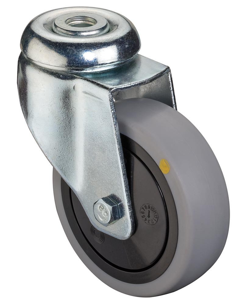ESD-Apparaterolle, Lenkrolle, Gummi thermoplastisch grau, Durchm. 75 mm, Traglast 60 kg, Kugellager, Rückenloch