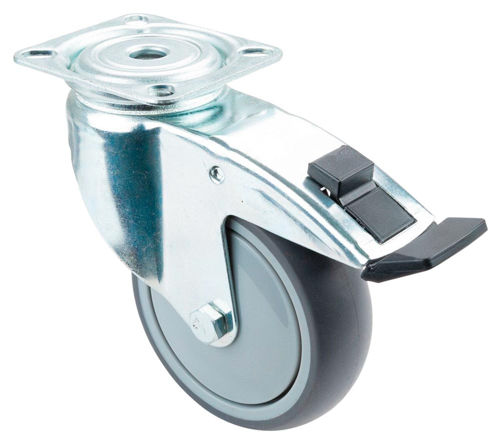 ESD-Apparaterolle, Lenkrolle m. Festst., Gummi thermoplastisch grau, Durchm. 100 mm, Traglast 100 kg, Kugellager, Anschraubplatte