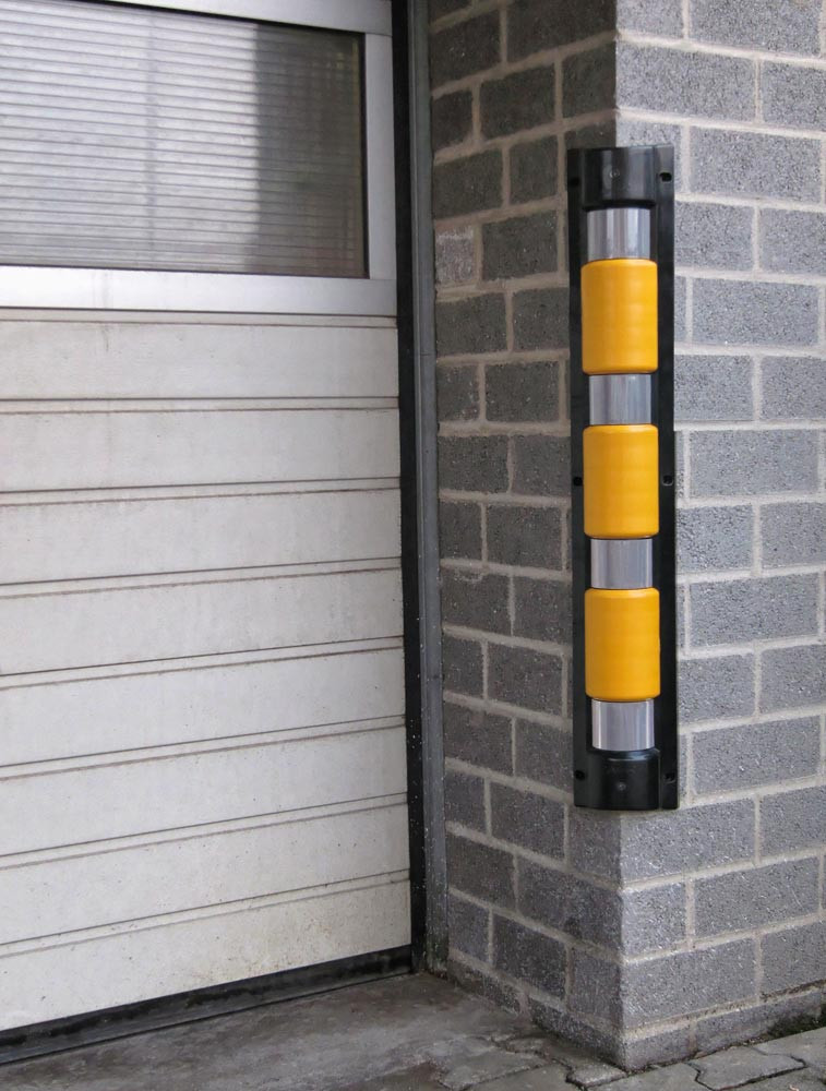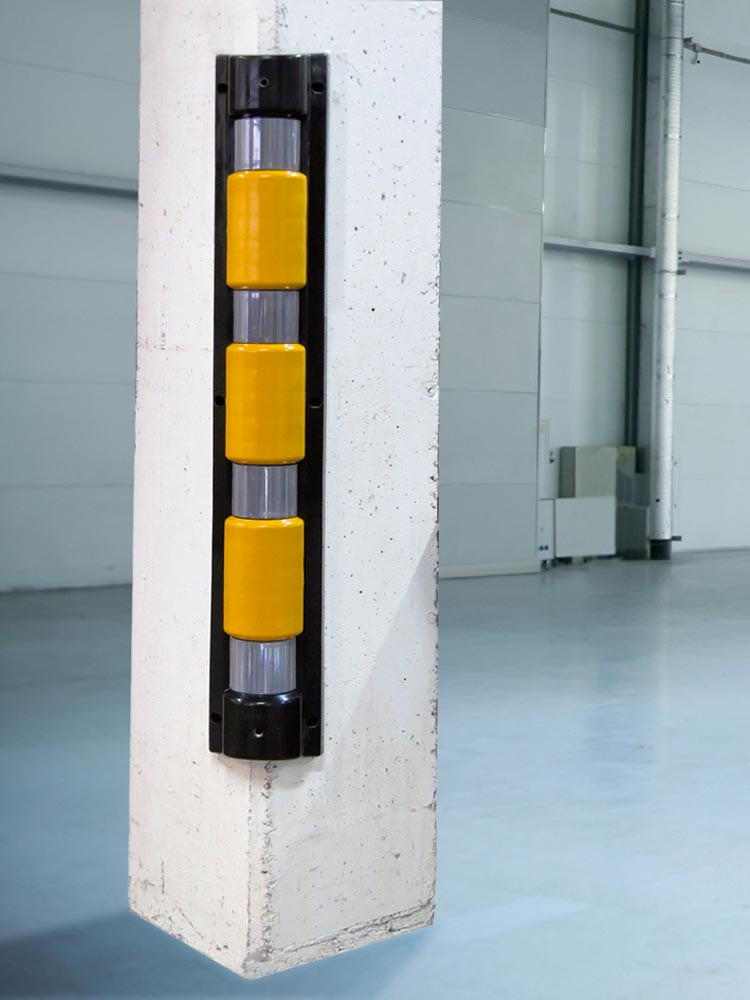 Eckschutzschiene, gelb-schwarz, 4 Ringe 270 Grad retroreflektierend und 3 Stoßabsorber aus gelben PVC, L. 900 mm, ohne Befestigungsmaterial