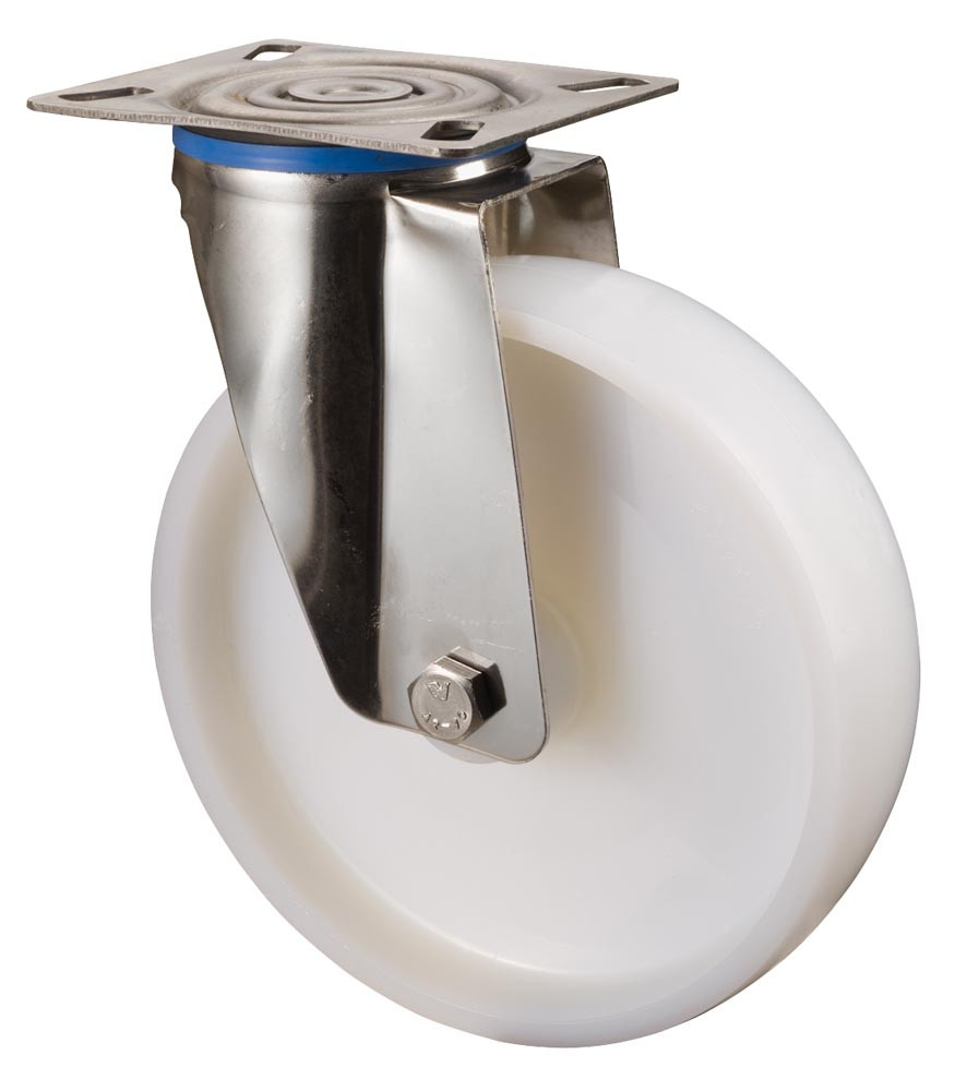 Edelstahl-Transportgeräte-Lenkrolle, Kunststoff weiß, Durchm. 200 mm, Traglast 300 kg, Gleitlager, Anschraubplatte E1617973