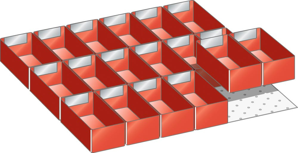 Einsatzkästen, Fronthöhe 100 mm, 18 Kästen 150x75 mm, Schubladennutzgröße BxT 459x459 mm E876137