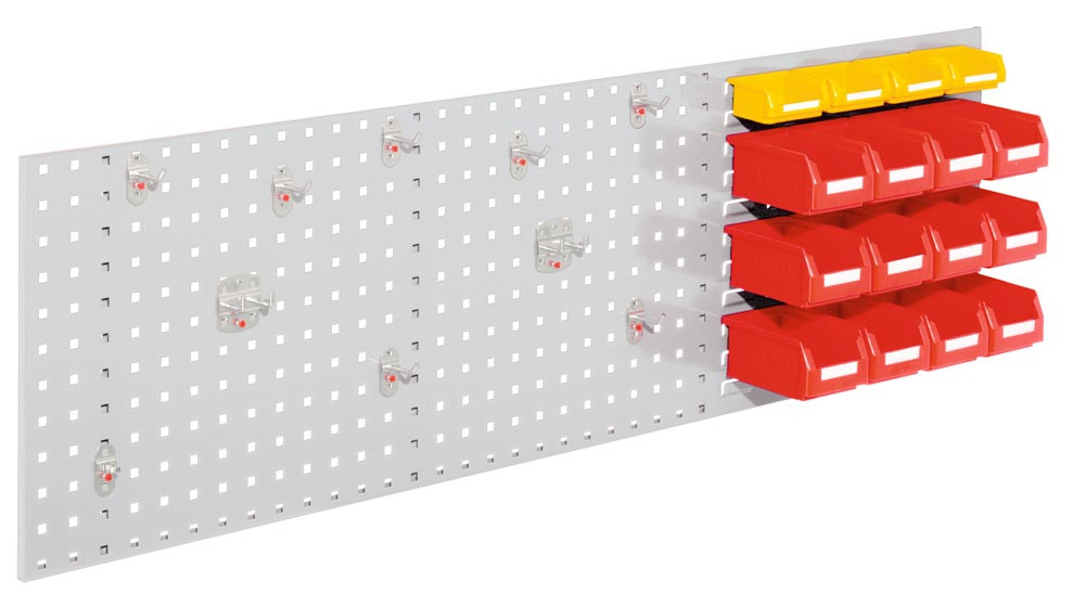 ∙ Einsteigerset bestehend aus: 1 Kombinationsplatte Loch-/ Schlitzplatte 1500 x 450 mm, 10-teiligem Werkzeughaltersortiment, 4 Lagersichtkästen B x T x H 105 x 85 x 45 mm und 8 Lagersichtkästen B x T x H 105 x 160 x 75 mm