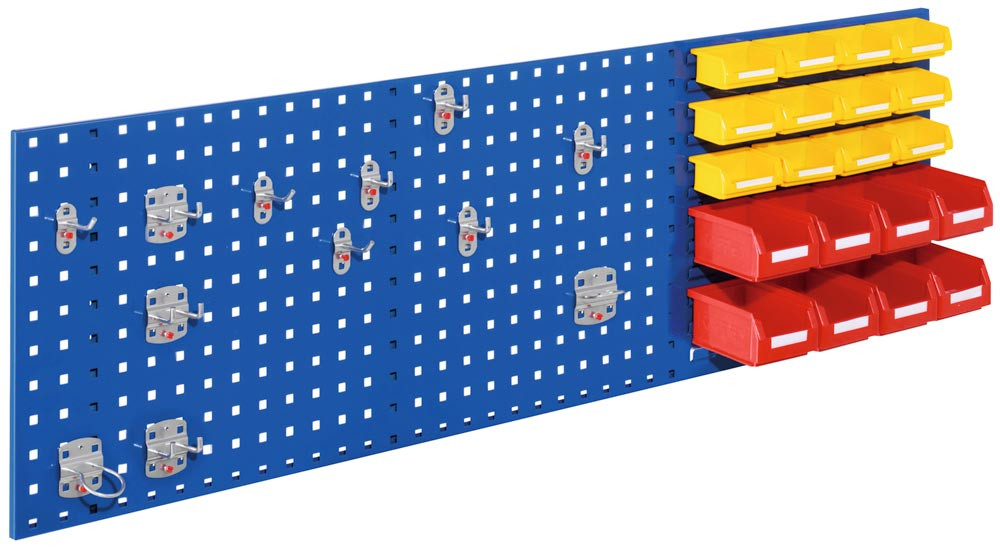 ∙ Einsteigerset bestehend aus: 1 Kombinationsplatte Loch-/ Schlitzplatte 1500 x 450 mm, 12-teiligem Werkzeughaltersortiment, 12 Lagersichtkästen B x T x H 105 x 85 x 45 mm und 8 Lagersichtkästen B x T x H 105 x 160 x 75 mm