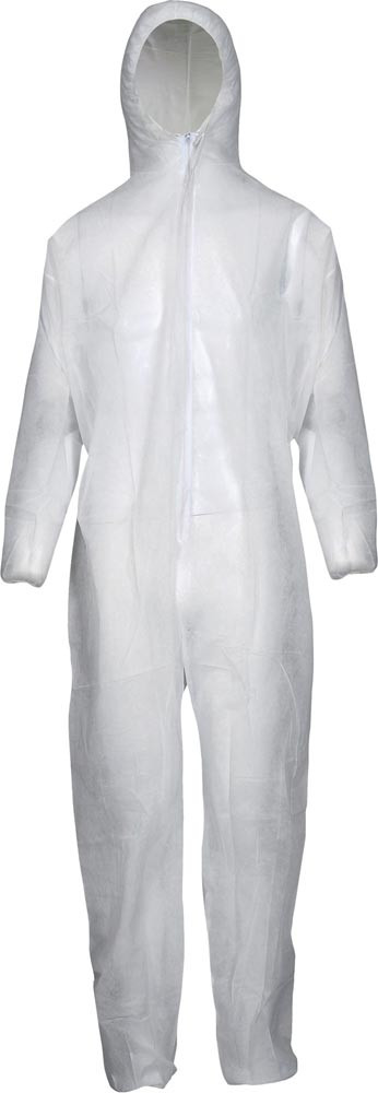 aus Polypropylen · mit Kapuze · Gesichts-, Taillen-, Arm- und Beingummi · verdeckter Reißverschluss · atmungsaktiv · Flächengewicht 40 g/m²