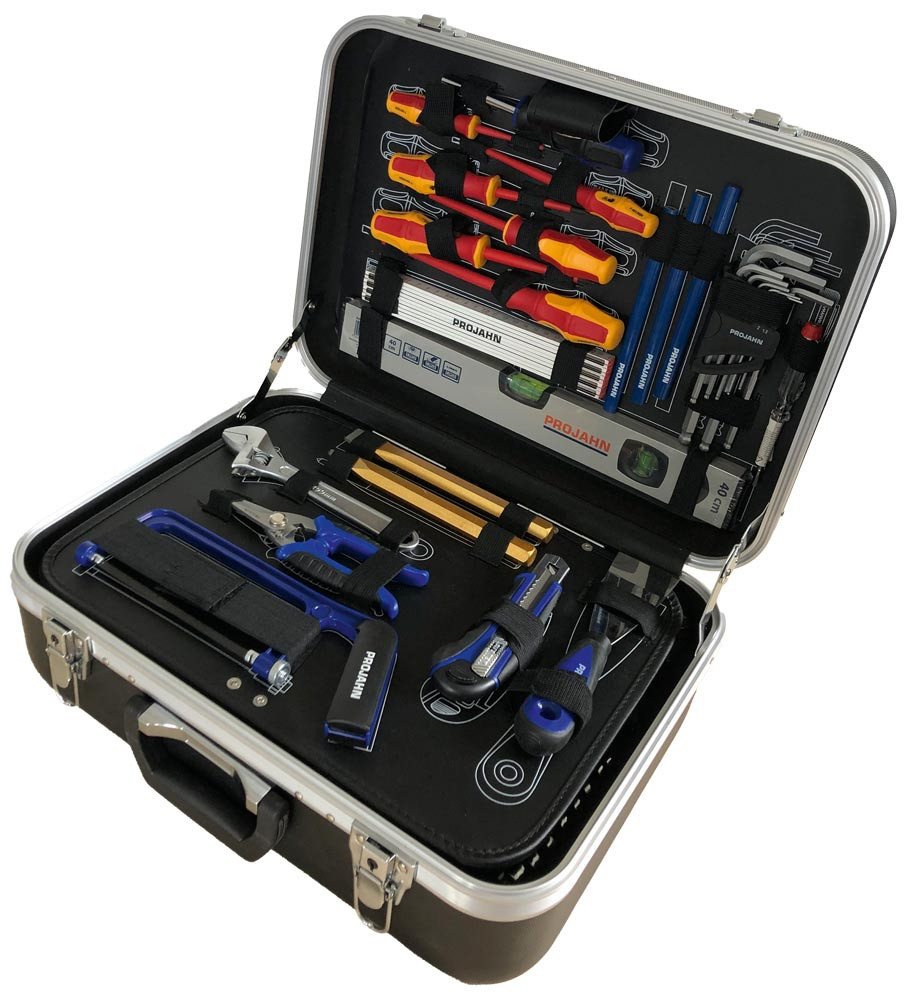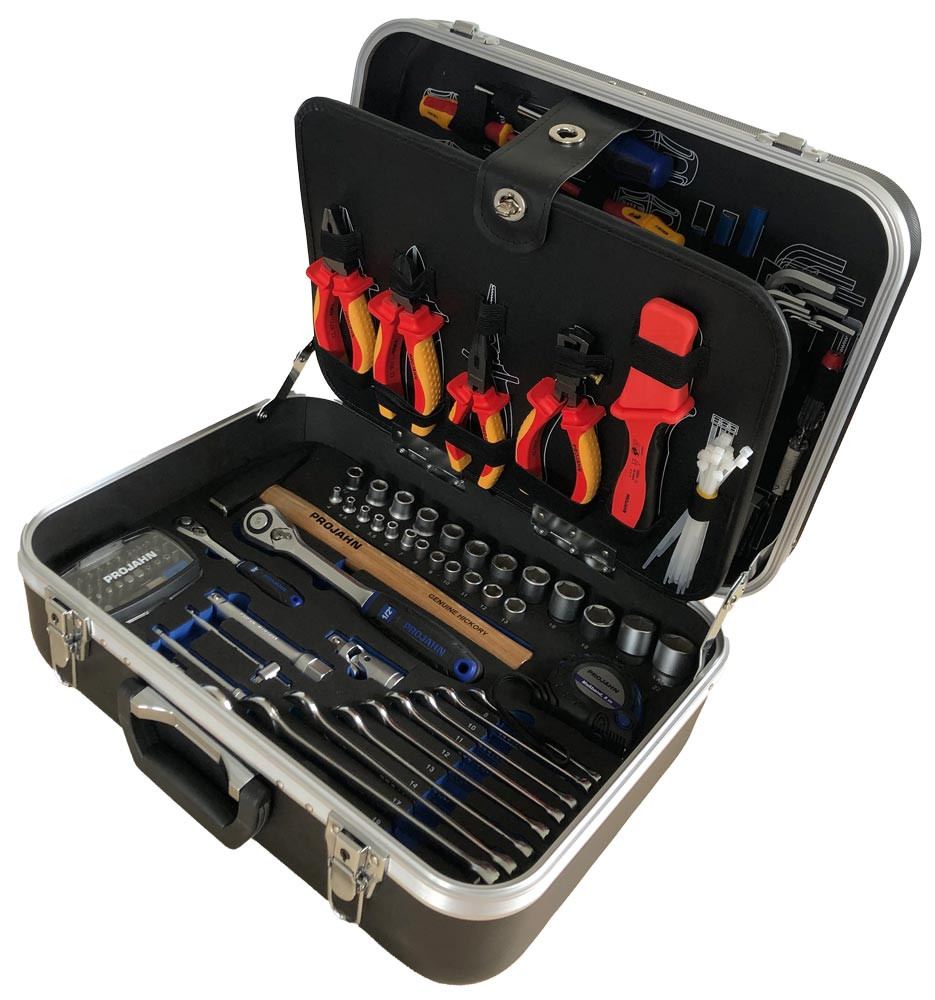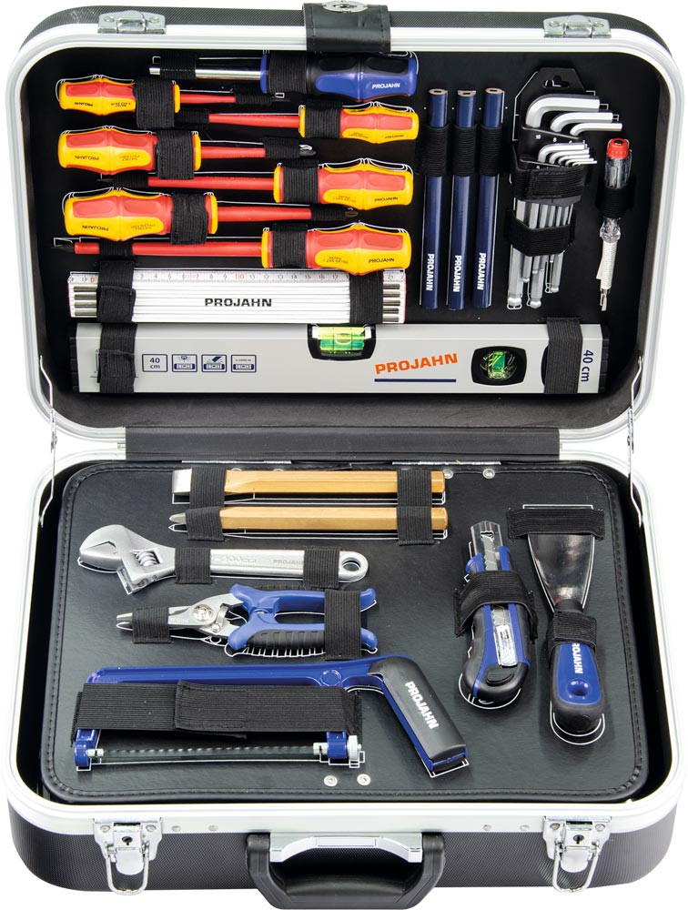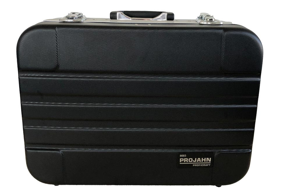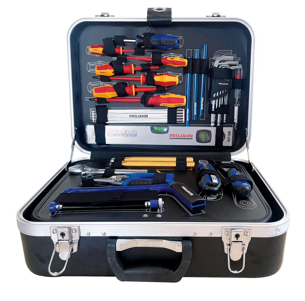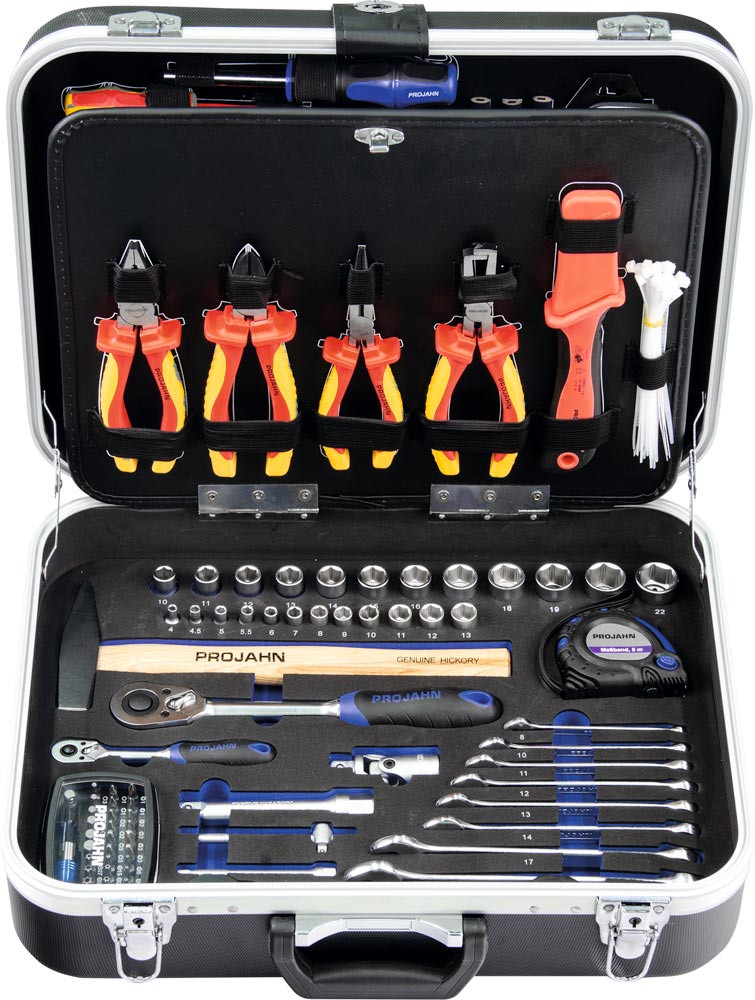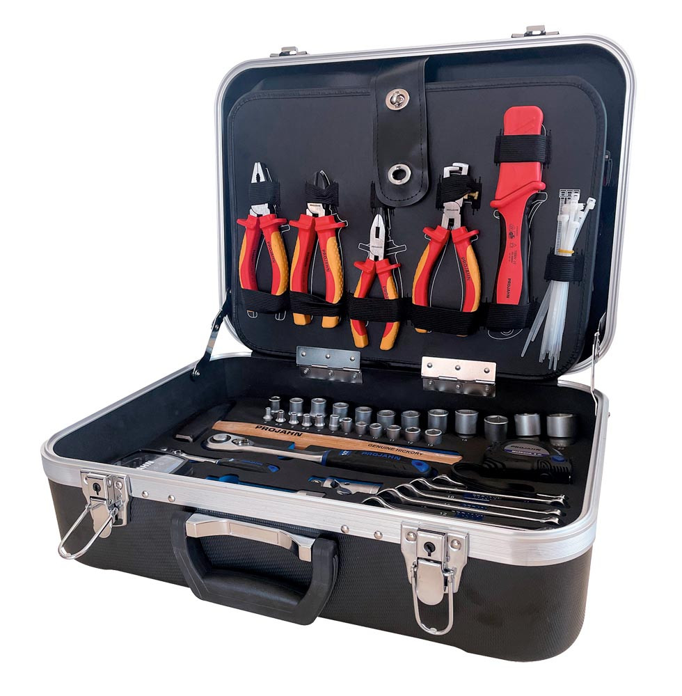 Ausführung: Umfangreiches "Profi-Werkzeug"-Sortiment für das Elektro-Handwerk in praxisgerechter Zusammenstellung ∙ Schalenkoffer aus schlagfestem ABS-Kunststoff ∙ Mit 2 doppelseitigen Werkzeugtafeln mit Einstecktaschen ∙ Zwei abschließbare Schlösser einschl. Schlüssel