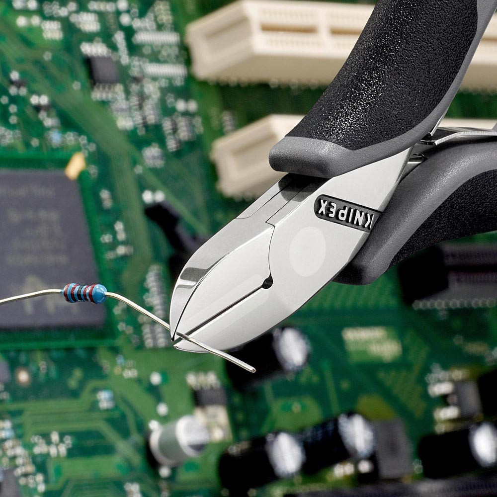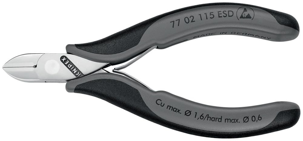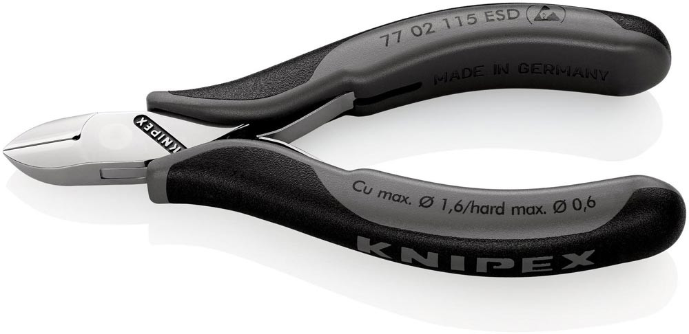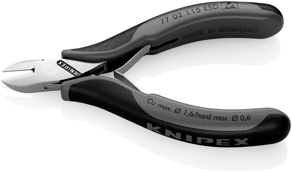 ESD · für feinste Schneidarbeiten z. B. in Elektronik und Feinmechanik · durchgestecktes, spielfreies Gelenk · Schneiden zusätzlich induktiv gehärtet, Schneidenhärte ca. 62 HRC · mit Öffnungsfeder · Spezial-Werkzeugstahl in Sondergüte geschmiedet, mehrstufig ölgehärtet · elektrisch ableitend - dissipativ