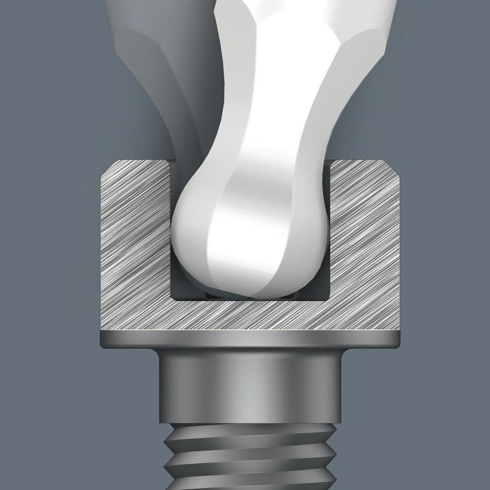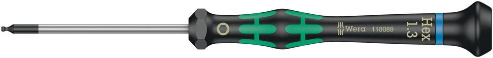 Hochwertiger Wera Micro Schraubendreher für feinmechanische Verschraubungen. Kugelkopfprofil: Durch die kugelförmigen Abtriebsprofile ist ein Auslenken oder Schwenken der Werkzeugachse zur Schraubenachse möglich · so dass dadurch ″um die Ecke″ geschraubt werden kann. Durch Abstützen der Hand auf der Drehkappe und durch die Schnelldrehzone unterhalb der Drehkappe ist blitzschnelles Zwirbeln möglich. Zeitintensives Umgreifen entfällt. Kraftzone mit integrierten Weichzonen sorgt für die Übertragung hoher Löse- und Anzugsmomente. Präzisionszone für den richtigen Drehwinkel bei Justierarbeiten. Die Wera Black Point-Spitze bietet Passgenauigkeit und optimierten Korrosionsschutz. Take it easy Werkzeugfinder mit Farbkennzeichnung nach Profilen und Größenstempelung - zum einfachen und schnellen Finden des benötigten Werkzeugs.