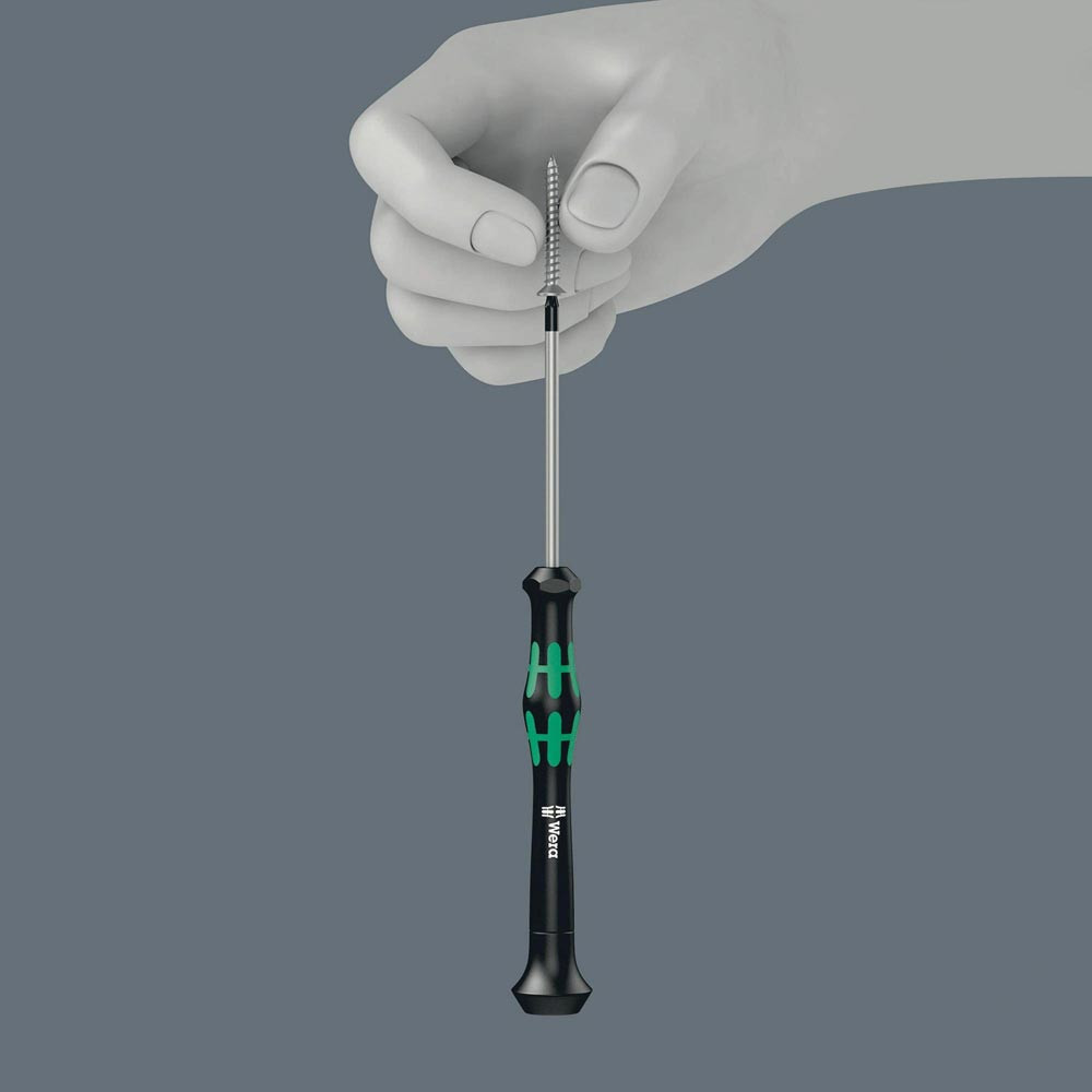 Hochwertiger Wera Micro Schraubendreher für feinmechanische Verschraubungen. Mit praktischer Haltefunktion: Durch die aus der Flächenpressung zwischen der Abtriebsspitze und Schraubenprofil resultierende Klemmkraft werden die Schrauben sicher auf dem Werkzeug gehalten. Durch Abstützen der Hand auf der Drehkappe und durch die Schnelldrehzone unterhalb der Drehkappe ist blitzschnelles Zwirbeln möglich. Zeitintensives Umgreifen entfällt. Kraftzone mit integrierten Weichzonen sorgt für die Übertragung hoher Löse- und Anzugsmomente. Präzisionszone für den richtigen Drehwinkel bei Justierarbeiten. Die Wera Black Point-Spitze bietet Passgenauigkeit und optimierten Korrosionsschutz. Take it easy Werkzeugfinder mit Farbkennzeichnung nach Profilen und Größenstempelung - zum einfachen und schnellen Finden des benötigten Werkzeugs.