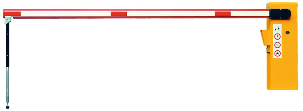 · Sperrbalkenlänge von 2,00 bis 6,00 m · Zum Aufdübeln · 230 Volt Anschluss · Gehäuse aus Stahl, beschichtet in RAL 1028 (melonengelb) · Schrankenbaum aus Aluminium (60 x 40 mm), ab 5,50 m 100 x 40 mm · Höhenverstellbare und gefederte Pendelstütze · Notentriegelung, Soft - Stopp, Automatik- oder Totmannbetrieb, zeitgesteuertes Schließen · Lieferung inkl. 1 Handsender