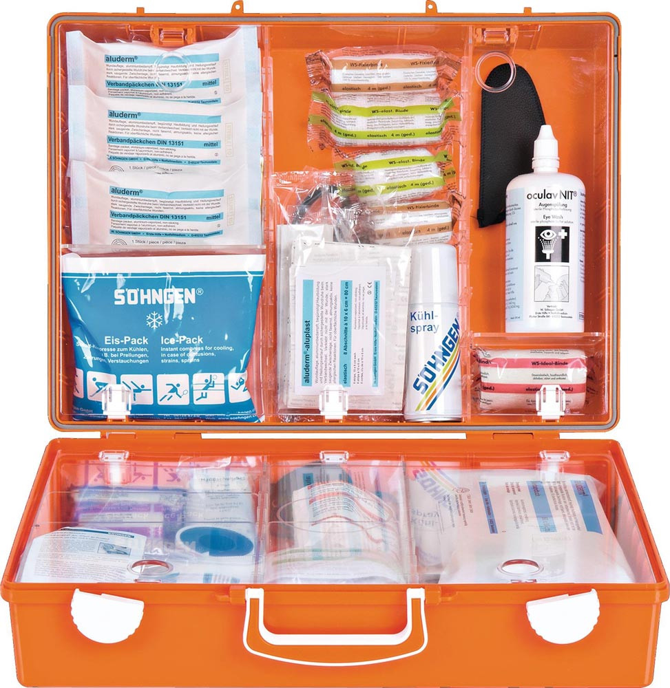 Zusatzinhalt: u.a. erhöhter aluderm®-aluplast-Pflasteranteil, aluderm®-Verbandstoffe, oculav NIT®-Augenspülung, Splitterpinzette, SÖHNGEN®-Kühlspray, Wundreinigungsset