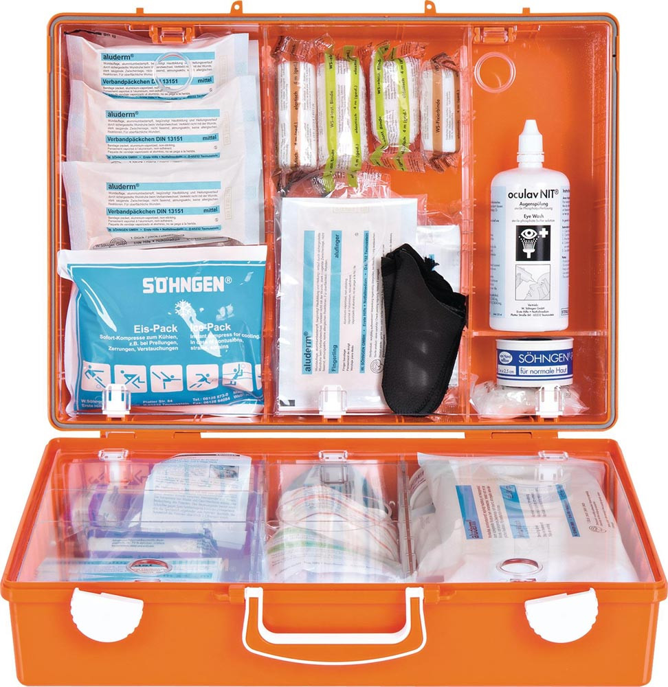 Zusatzinhalt: u. a. oculav NIT®-Augenspülung, Hand- und Wundreinigungsset, WS-Universalbinden, erhöhter aluderm®-aluplast-Pflasteranteil, aluderm®-Spezialverbandstoffe, Splitterpinzette