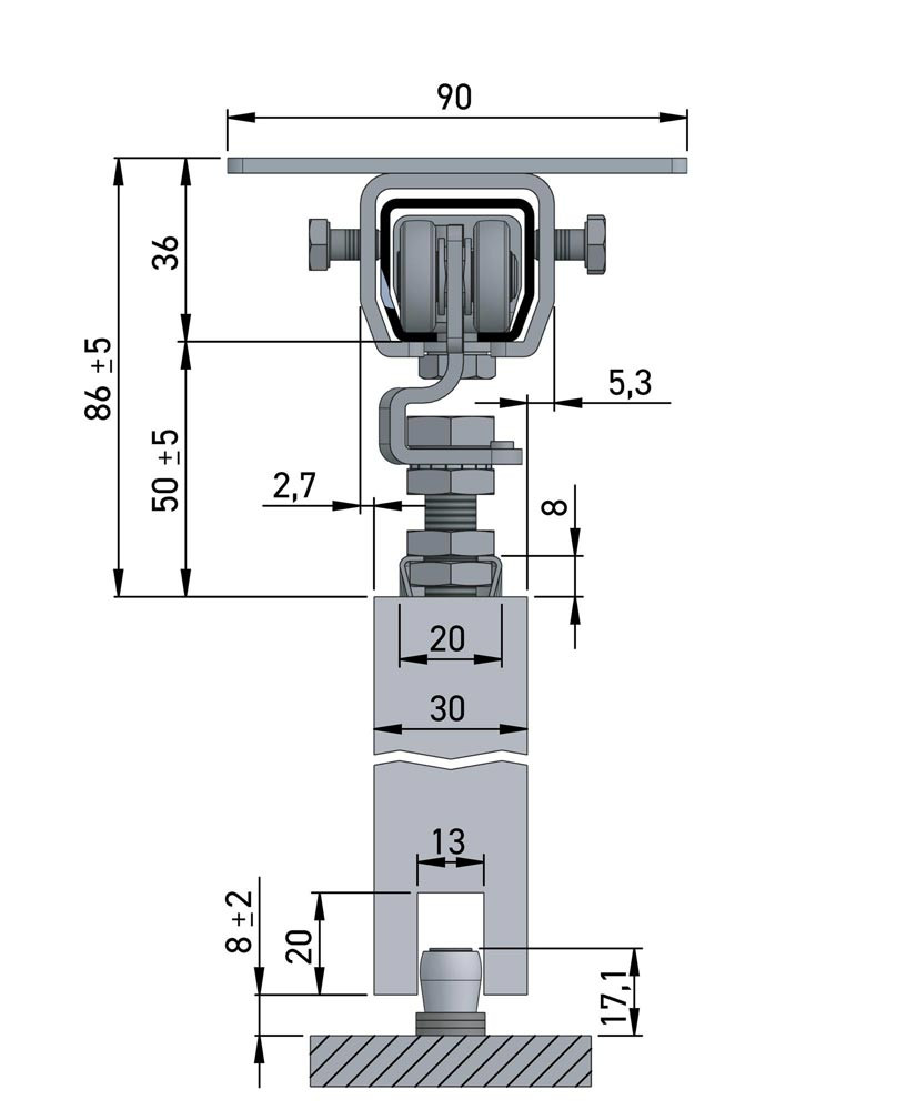 Erweiterungsset Schiebetorgarnitur Profil 100 Decke blau verzinkt Laufprofillänge 2000 mm Flügelgewicht max. 100 kg