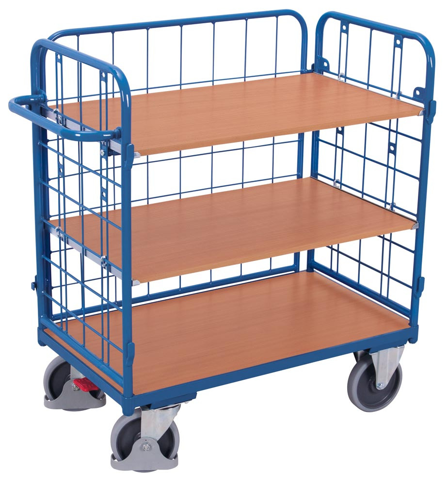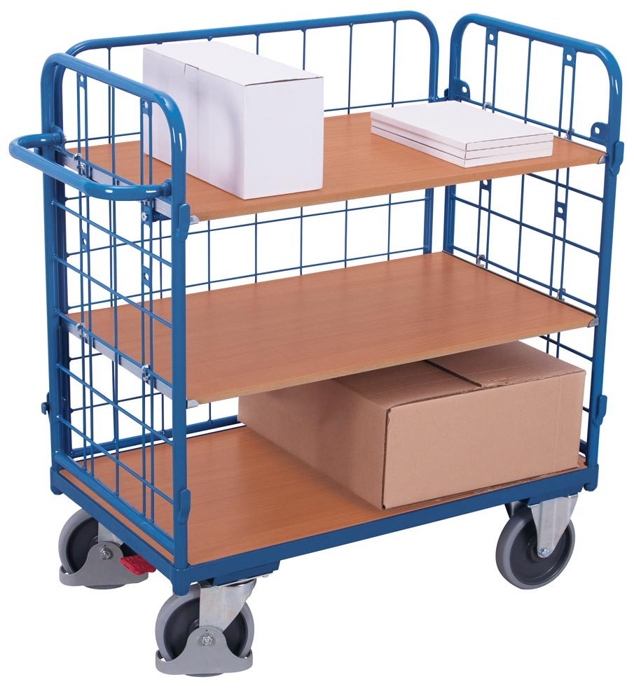 Etagenwagen, 3 Gitterwände, 3 Ladeflächen LxB 850x500 mm, LxBxH 1040x525x1180 mm, Traglast 400 kg