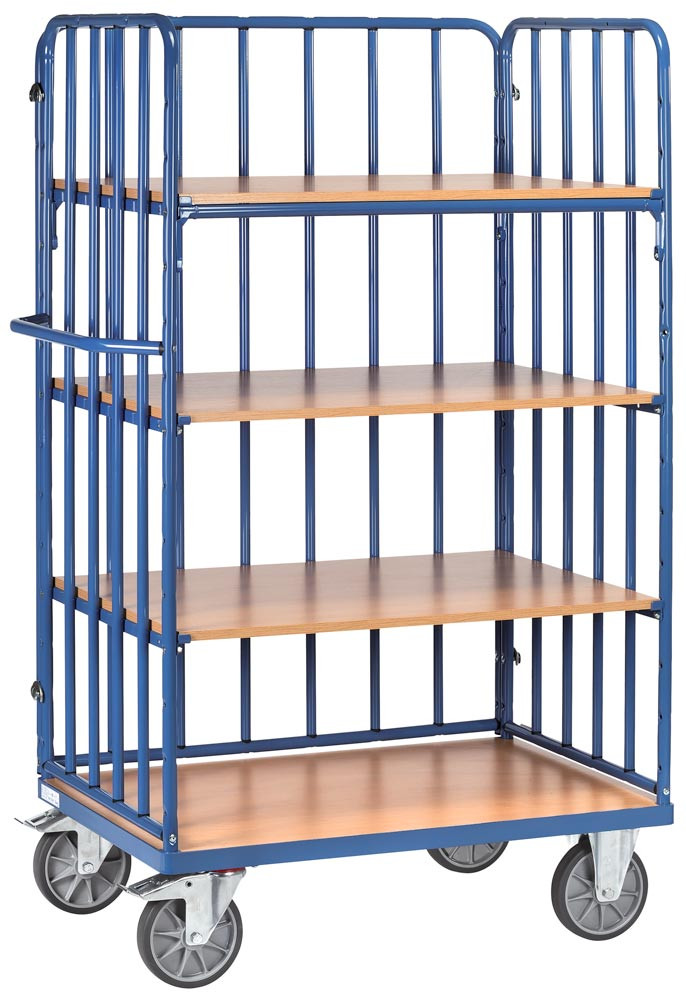 Etagenwagen, 3 Wände mit vertikalen Streben, 4 Ladeflächen LxB 1000x700 mm, Außenmaße LxBxH 1169x730x1800 mm, Traglast 600 kg, RAL 5007 brillantblau