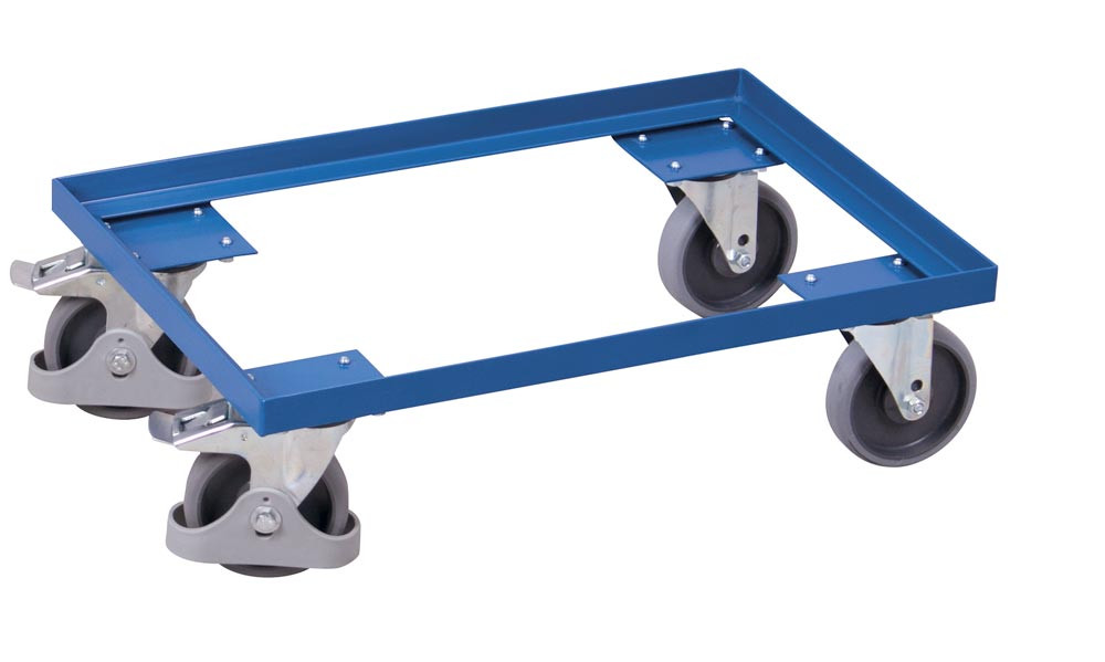 · Passend für Eurokästen 600 x 400 mm ∙ Winkelstahl-Konstruktion ∙ Pulverbeschichtet RAL 5010 enzianblau ∙ Schlag- und kratzfest ∙ 4 Lenkrollen ∙ 2 Lenkrollen gemäß EN 1757-3 mit Rad-Feststeller und Fußschutz ∙ Thermoplastische Vollgummi-Bereifung, grau "spurlos" ∙ Naben mit Präzisions-Rillenkugelagern und Fadenschutz