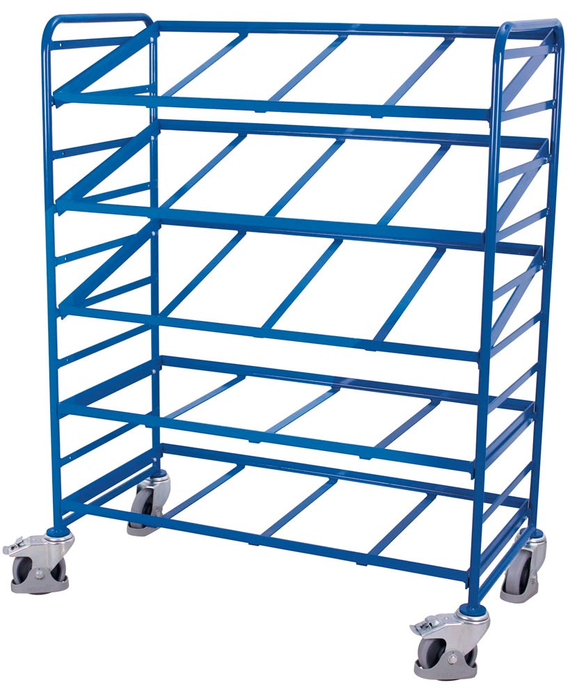 · Stahlrohr- und Winkelstahlkonstruktion · RAL 5010 enzianblau pulverbeschichtet · Schlag- und kratzfest · Neigung der Ladeflächen bei schrägem Einbau bis 15° und 30° · 4 Lenkrollen, 2 davon gemäß EN 1757-3 mit Rad-Feststeller und Fußschutz · Thermoplastische Vollgummi-Bereifung, grau "spurlos" · Naben mit Präzisions-Rillenkugellager und Fadenschutz