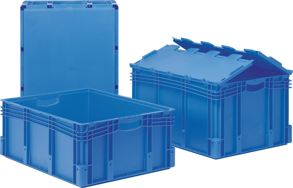 ∙ Euro-Stapelbehäler aus Polypropylen (PP) ∙ Mit Standard- oder Doppelboden mit Kufen · Maßlich auf die Europalette abgestimmt, hohe Stapelsicherheit durch umlaufenden Stapelrand ∙ Temperaturbeständig von -20 °C bis +90 °C ∙ Großer Griff mit abgerundeter Auflage ∙ Gerundetes Eckholmprofil ∙ Hubschächte ∙ Allseitige Zieh- und Schieberippen, Etikettenhalterung und Zentrierlöcher · Behälterfarbe grau ab 250 Stück auf Anfrage · Farbe blau