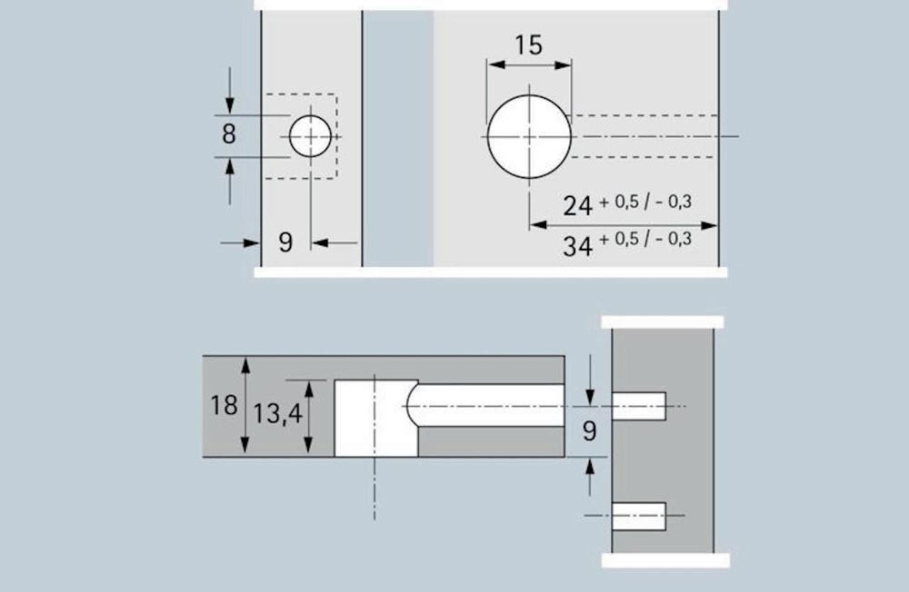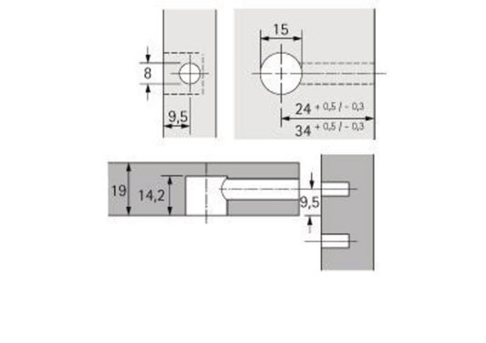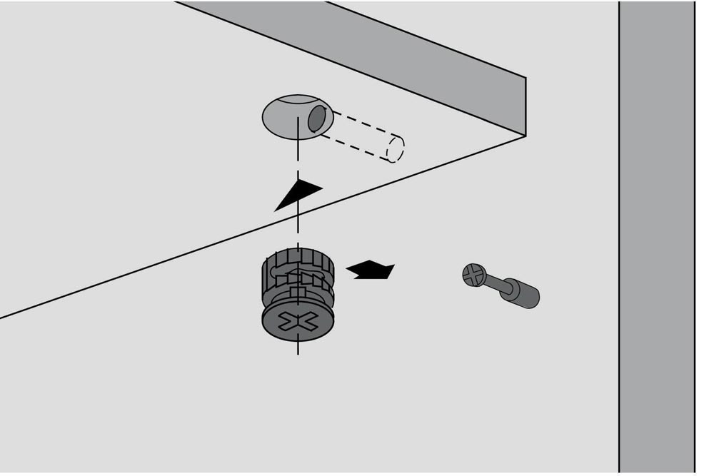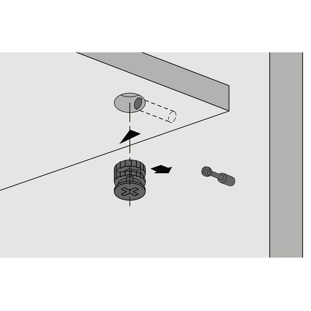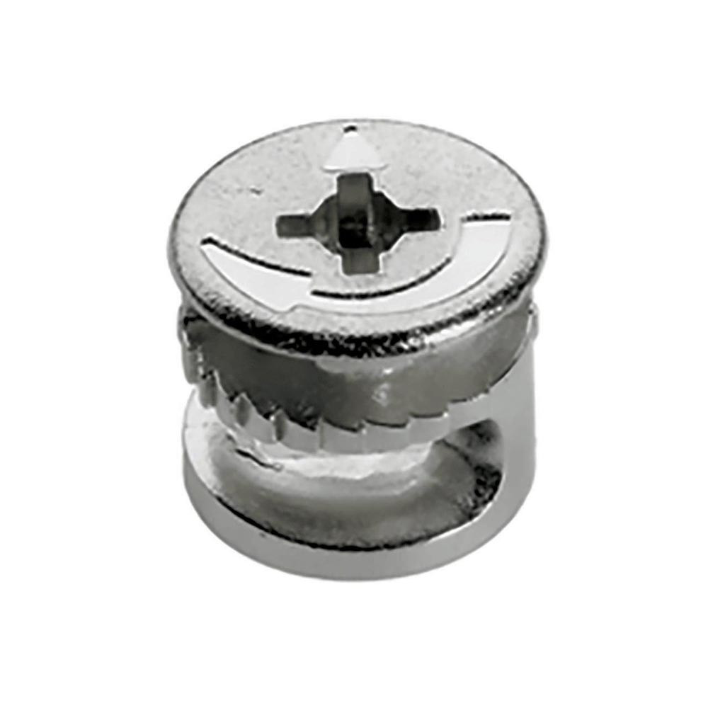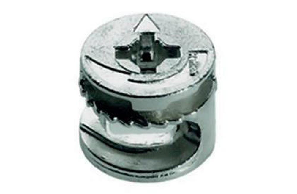 mit Anzughilfe · Möbelseiten können mit bis zu 4 mm zur Stirnseite des Fachbodens herangezogen werden · doppelte Sicherheit durch Innen- und Außenrastung · der Dübel wird immer zentrisch angezogen · ein Versetzen der Möbelteile ist somit ausgeschlossen · Exenter kann mit Schlitz-, Kreuzschlitzklinge PZ3 oder Sechskantschlüssel SW verspannt werden · Zinkdruckguss
