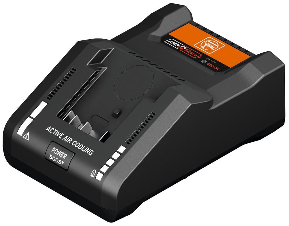 Kurze Ladezeiten dank des hohen Ladestroms von 16 Ampere, Power Boost Lademodus, aktiver Luftkühlung und prozessgesteuerten Lademanagements ∙ Mit Ladestandsanzeige und Vorrichtung zur Wandmontage ∙ Für alle Akku-Packs mit AMPShare oder Bosch Professional 18 V Akku-Schnittstelle