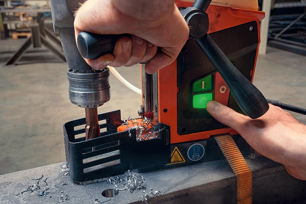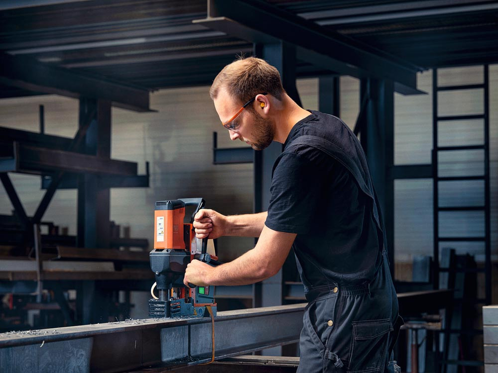 Kleine und leichte 1-Gang Endurance-Magnet-Kernbohrmaschine ∙ Dank einzigartiger Performance wird die Bohrzeit halbiert ∙ Schnittgeschwindigkeiten von bis zu 70 m/min ∙ Extrem verschleißarmes Maschinenkonzept mit bürstenlosem 1 600 W Hochleistungsmotor ∙ Integrierter Kühlmitteltank sorgt für hohe Kernbohrerstandzeiten ∙ Kippsensor stoppt unmittelbar den Bohrmotor beim Verrutschen oder Kippen der Maschine