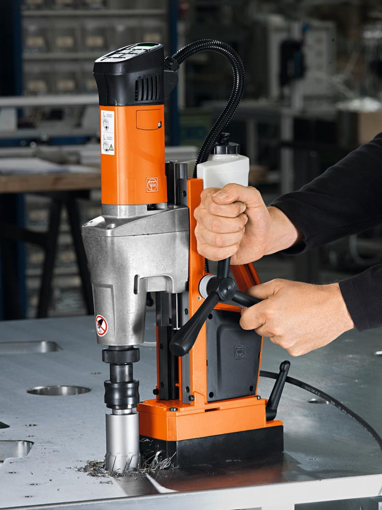 Leichtgewichtige und hubstarke 2-Gang-Universal-Magnet-Kernbohrmaschine ∙ 1300 W Hochleistungsmotor mit Tachoelektronik für hohe Drehzahlstabilität für zuverlässiges Arbeiten ∙ Durch Rechts-/Linkslauf, elektronische Drehzahleinstellung und 315 mm Hubbereich ist ein universeller Arbeitseinsatz, wie Kern-, Spiral-, Gewindebohren sowie Senken und Reiben möglich ∙ Mit schwenkbar gelagertem Motorkabel-Schutzschlauch ∙ MK3-Werkzeugaufnahme ∙ Integrierter Kühlmitteltank sorgt für hohe Kernbohrerstandzeiten ∙ Drehzahlspeicher "Memory Function" ∙ Feinjustierung der Bohrspindel zur komfortablen Ausrichtung der Maschine