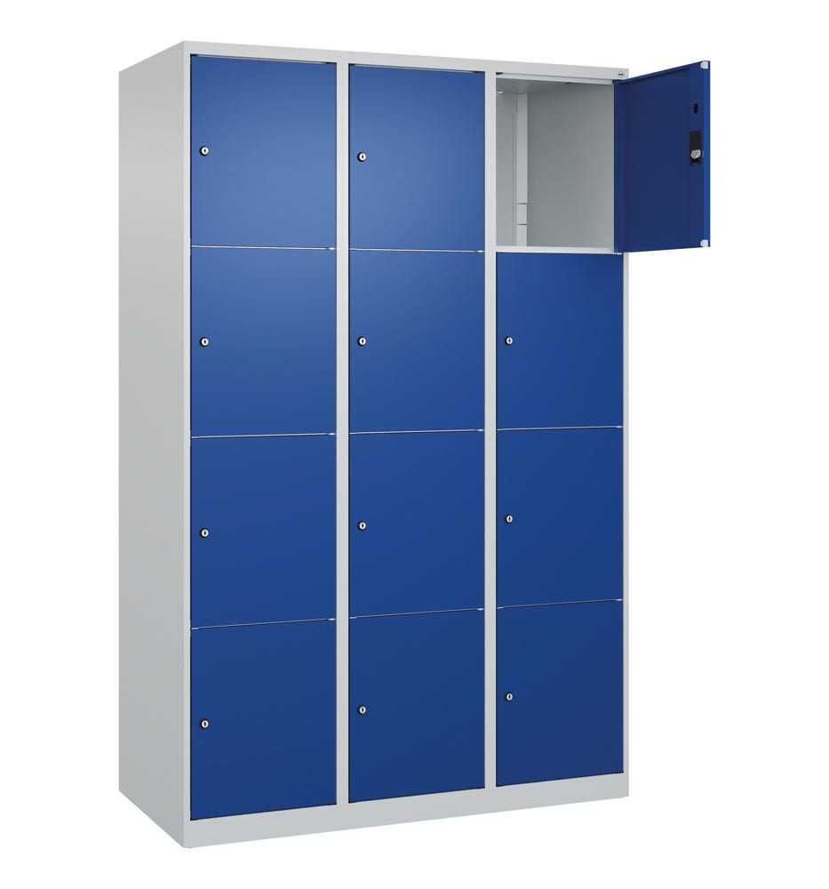 Fächerschrank, BxTxH 1200x500x1850 mm, 3x4 Fächer, Abt.B 400 mm, bodenstehend, Schloss, glatte Türen, RAL 7035/5010