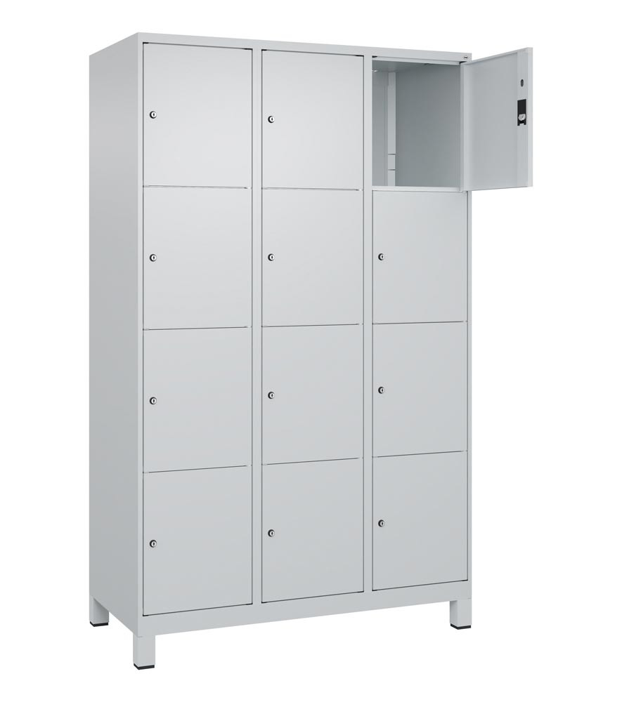 Fächerschrank, BxTxH 1200x500x1950 mm, 3x4 Fächer, Abt.B 400 mm, Füße, Schloss, glatte Türen, RAL 7035