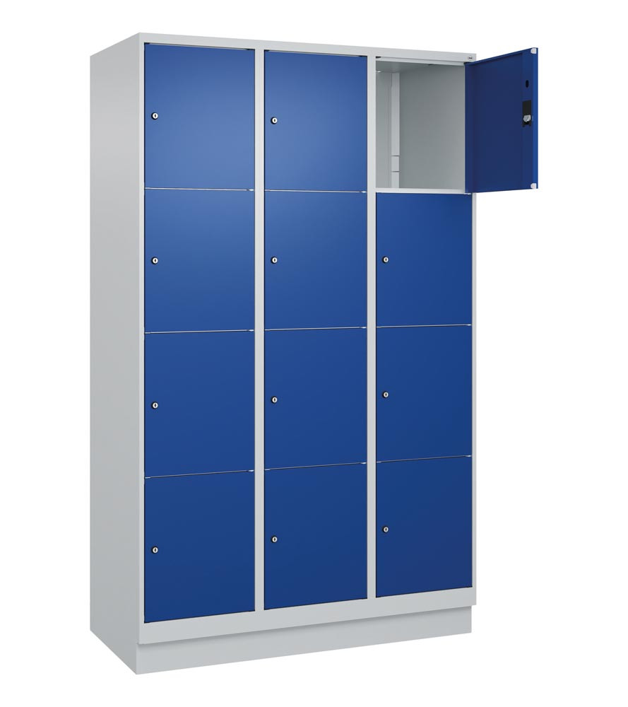 Fächerschrank, BxTxH 1200x500x1950 mm, 3x4 Fächer, Abt.B 400 mm, Sockel, Schloss, glatte Türen, RAL 7035/5010