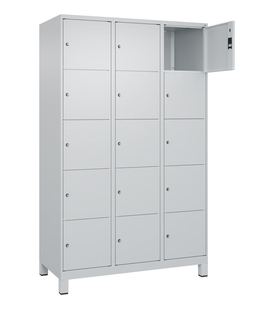 Fächerschrank, BxTxH 1200x500x1950 mm, 3x5 Fächer, Abt.B 400 mm, Füße, Schloss, glatte Türen, RAL 7035