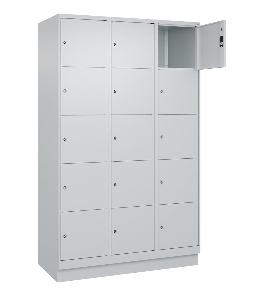 Fächerschrank, BxTxH 1200x500x1950 mm, 3x5 Fächer, Abt.B 400 mm, Sockel, Schloss, glatte Türen, RAL 7035