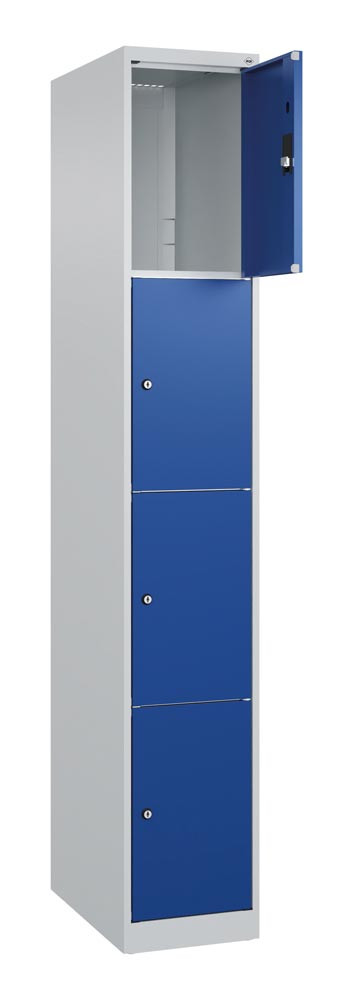 Fächerschrank, BxTxH 300x500x1850 mm, 1x4 Fächer, Abt.B 300 mm, bodenstehend, Schloss, glatte Türen, RAL 7035/5010 E6479267